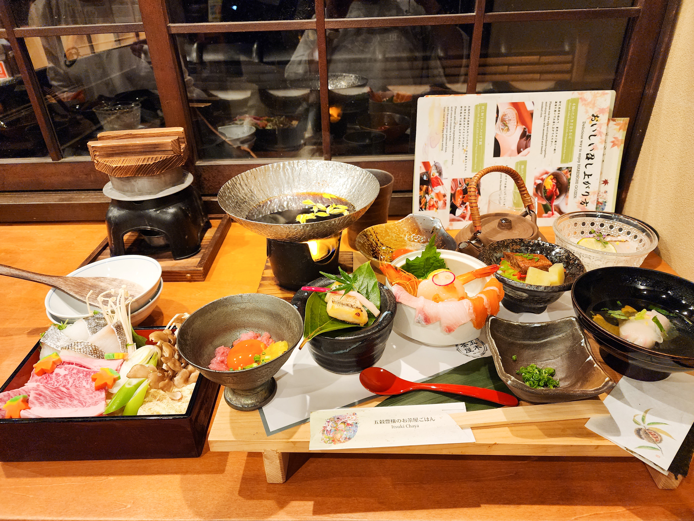 다섯 가지 종류의 덮밥과 스키야키를 맛볼 수 있다.
