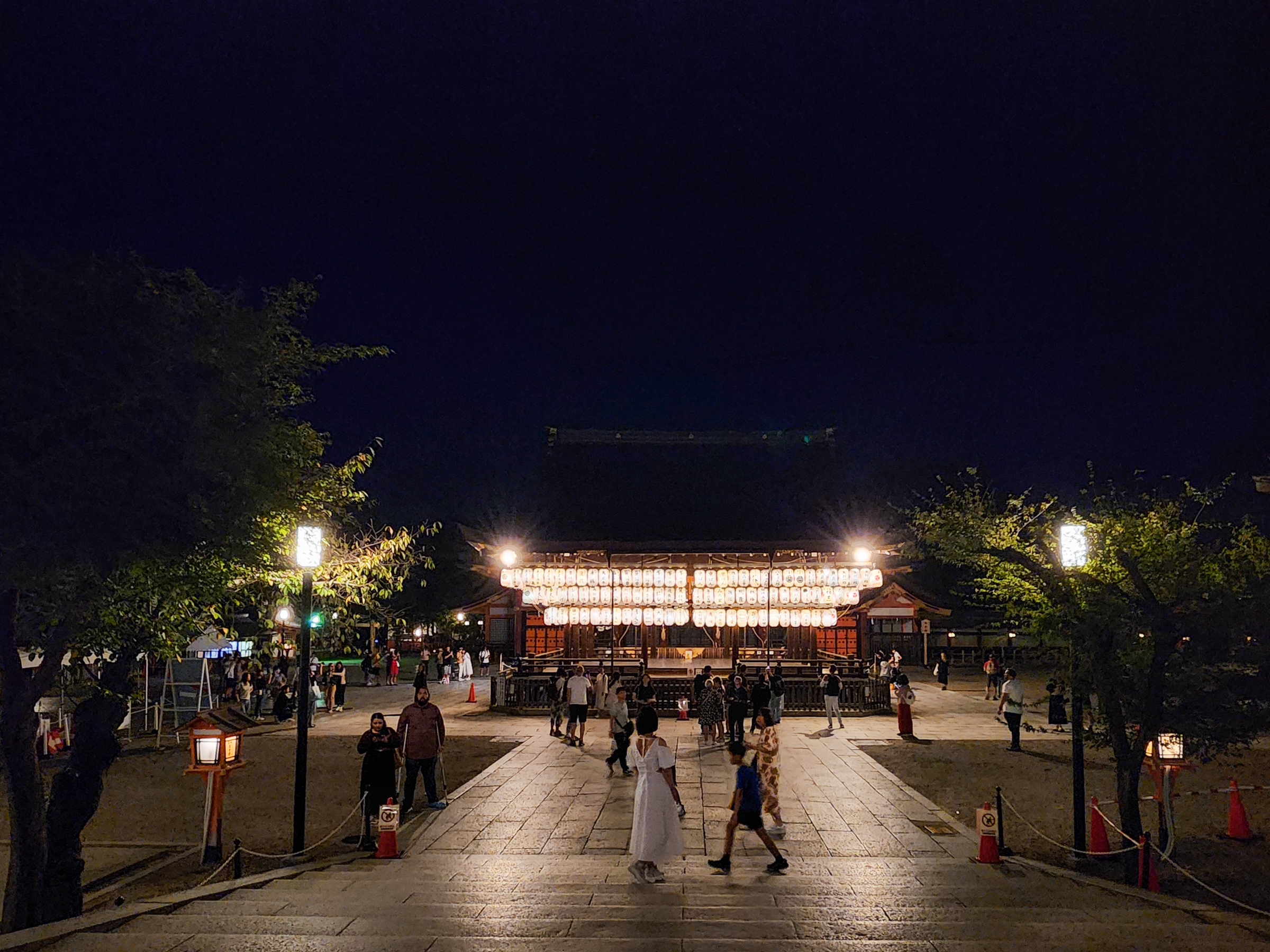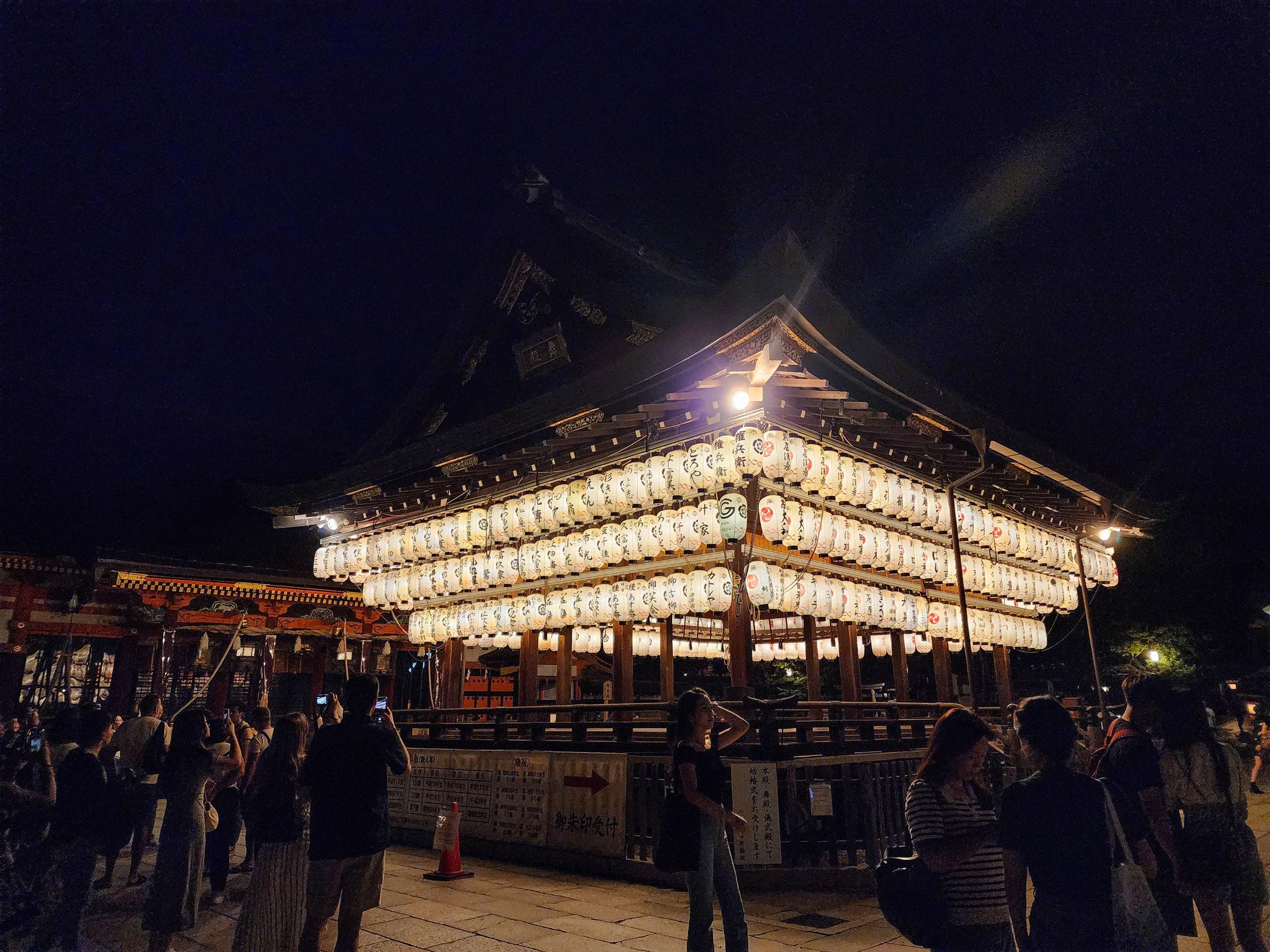 24시간 출입을 허용하는 야사카 신사는 밤이 무색할 만큼 밝은 빛으로 빛나고 있다. 밝은 빛의 주된 발원지는 신사의 중심에 자리 잡고 있는 무전(舞殿)이다. 이름 그대로 춤을 추는 무대로, 기온 마쓰리나 결혼식 등 각종 행사와 공연이 열리는 곳이다. 처마 아래로 매달려 있는 수백 개의 등불이 밤새도록 주변을 밝힌다.
