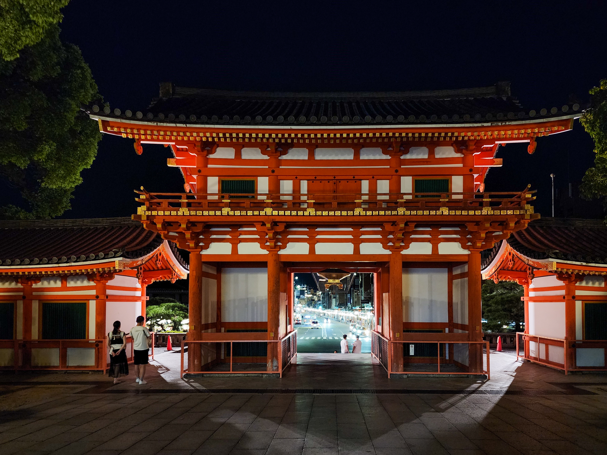 무전을 지나 몇 개의 말사(末社)가 모여 있는 길을 따라가면 야사카 신사의 서루문이 나온다. 이곳에서 내다보이는 기온 거리의 밝은 가로등과 자동차 헤드라이트가 현대의 교토를 제시한다.