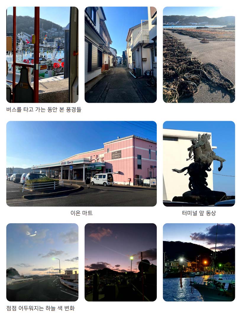 버스는 이키의 다양한 풍경을 거쳐 처음 출발했던 혼마치의 버스 정류장으로 돌아왔다. 시간은 아직 오후 네 시가 안 되어 있었다. 혼자서 딱히 할 게 없는 혼마치에서 일곱 시까지 에미카를 기다릴까? 그냥 아까 탄 버스와 반대 방향으로 도는 버스를 한 번 더 타기로 했다. 어디서 혼자 가만히 있느니 버스 안에서 해 지는 풍경을 보는 게 더 낫겠다 싶었다.