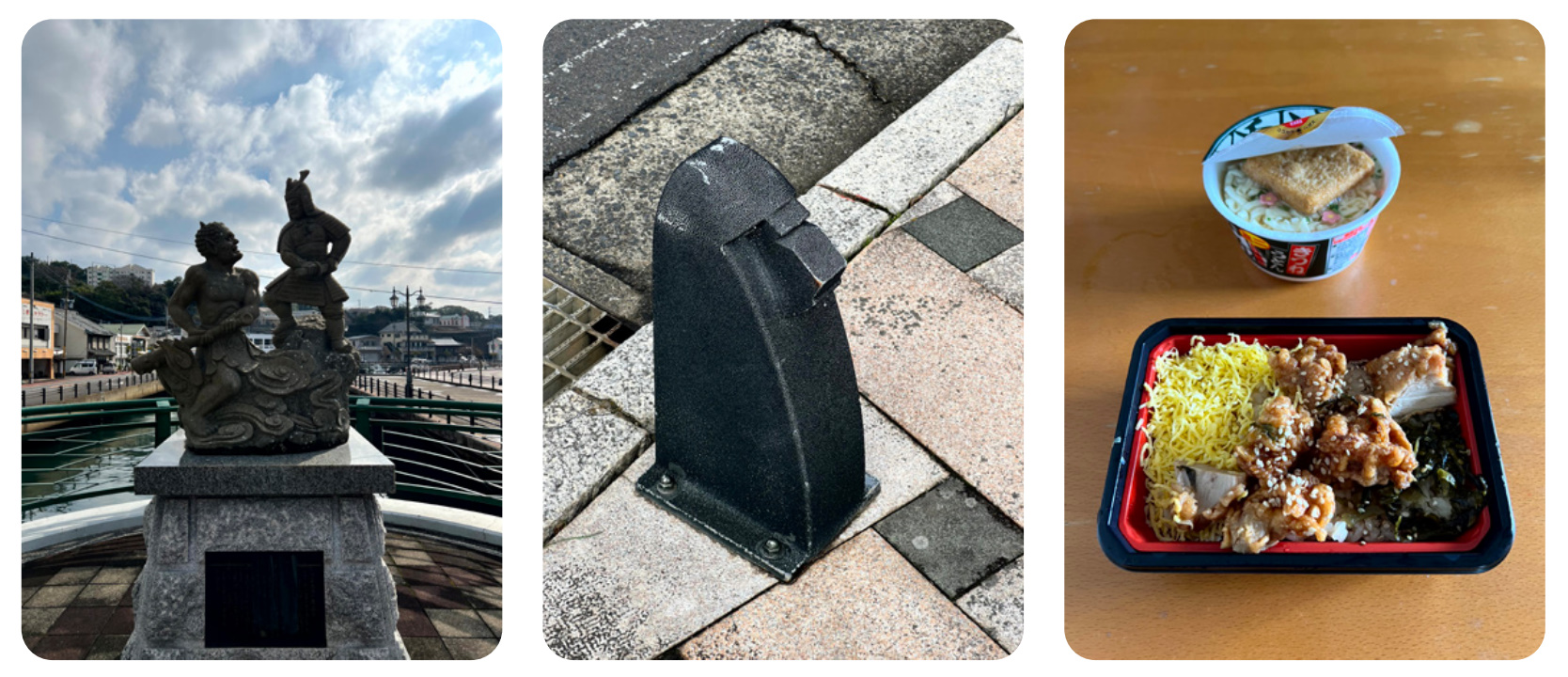 건물 안에는 모스버거와 작은 기념품점, 잡화점, 서점, 100엔숍 등이 모여 있었고 이키에서 유일하게 사람이 많은 곳 같았다. 마트 건너편에는 아시베항 페리 터미널이 있었는데, 그 앞에 말에 올라탄 어느 장군의 동상이 세워져 있었다. 그렇게 15분간 초스피드로 구경을 마치고 다시 버스에 올라탔다.