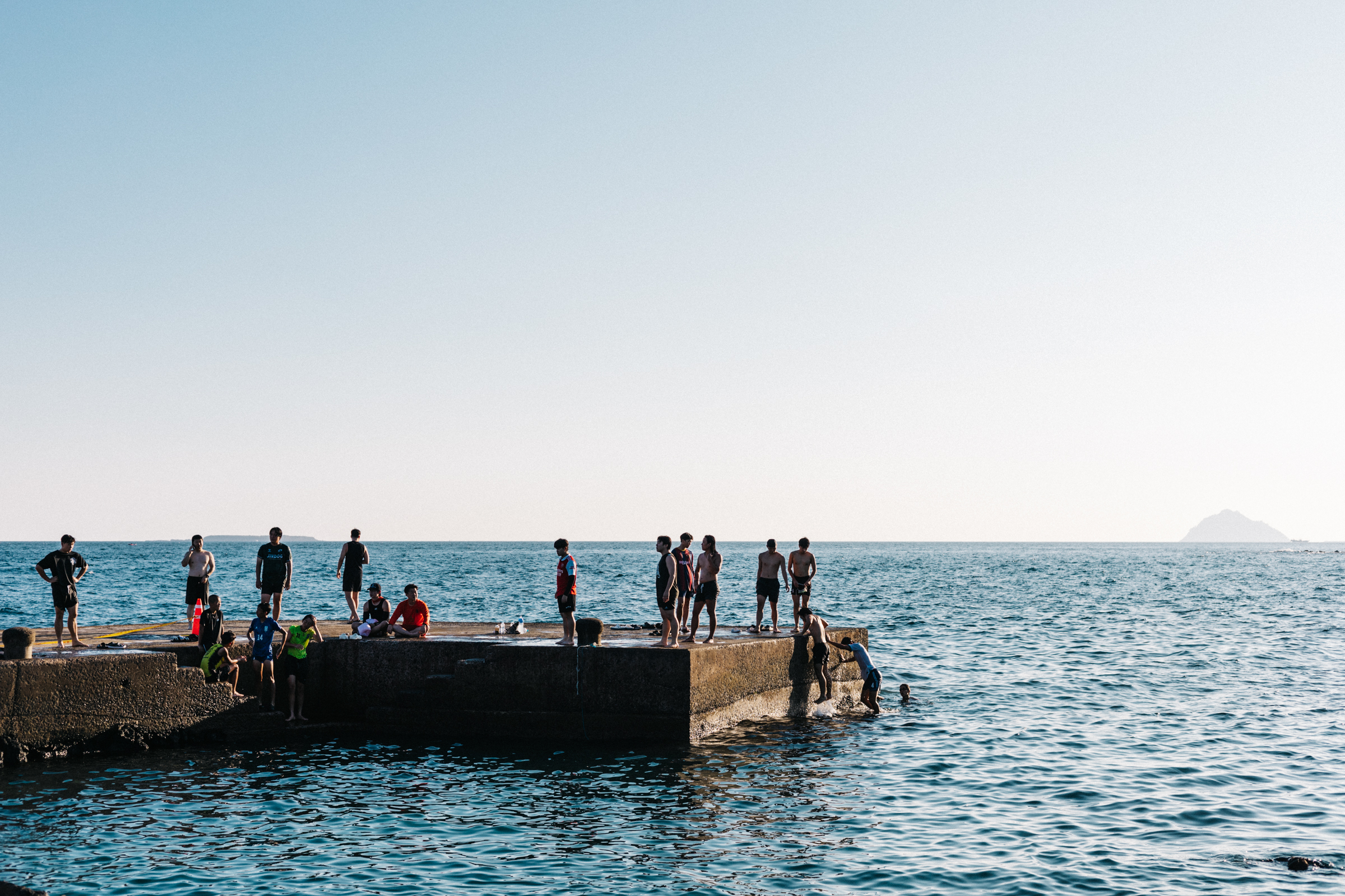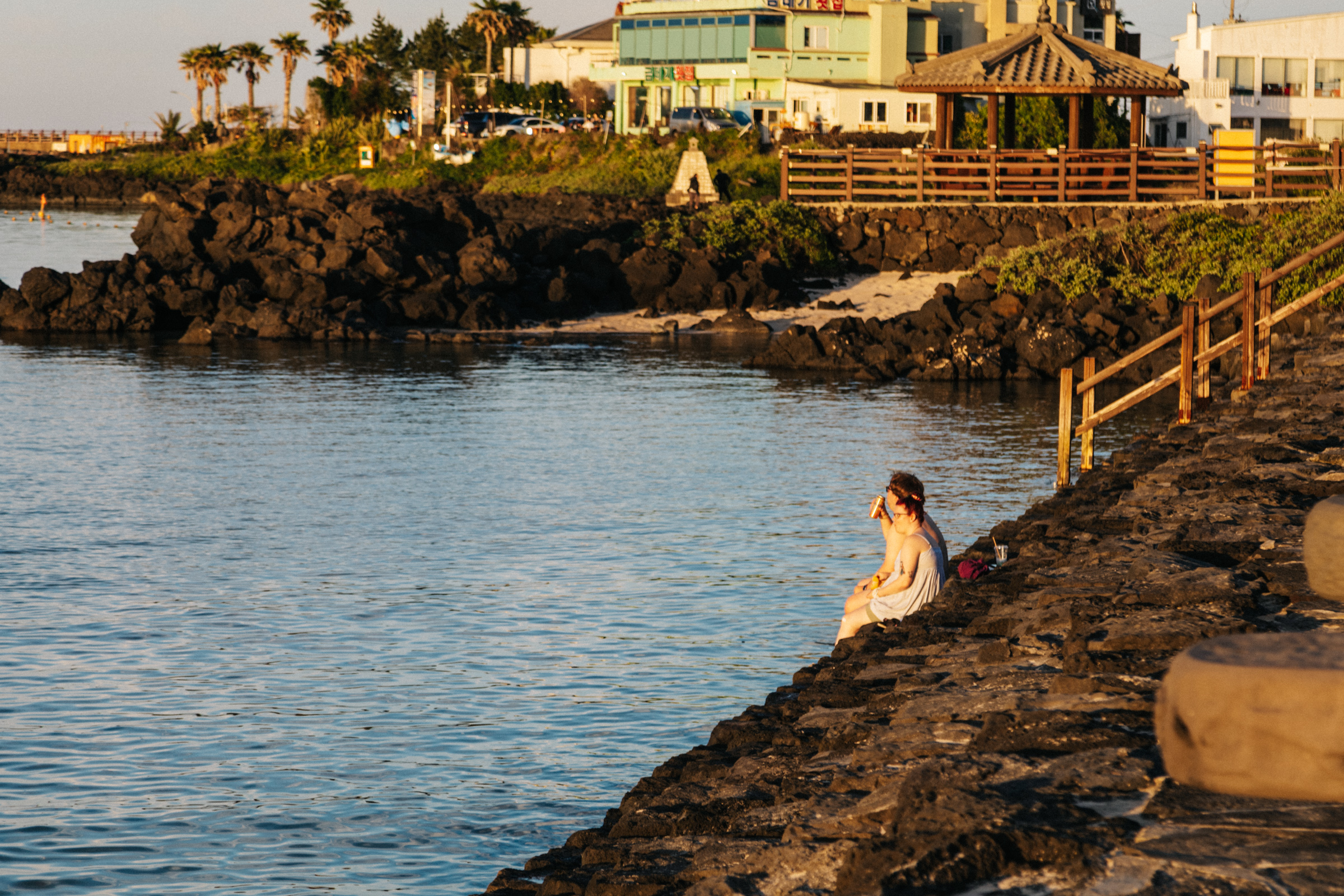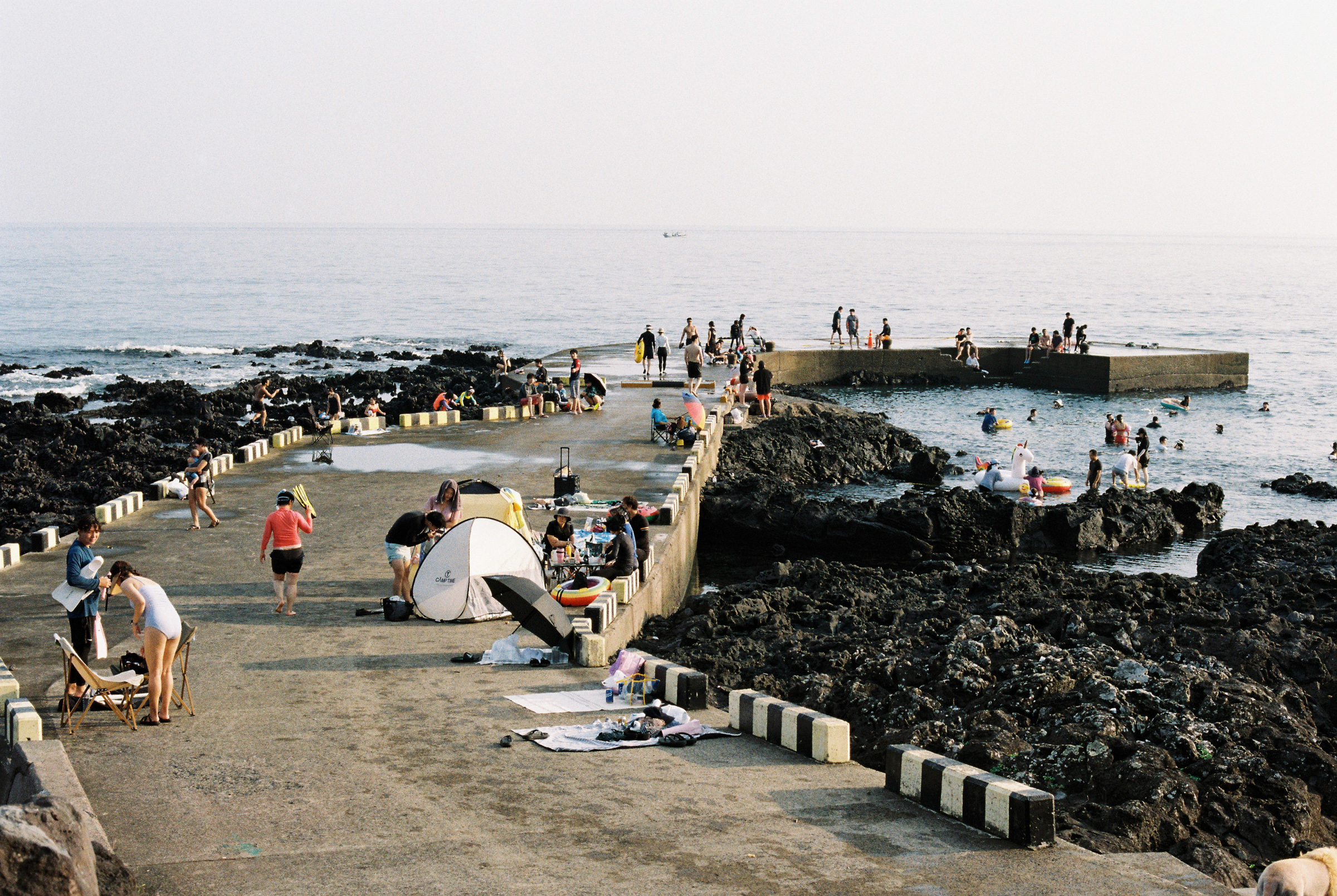 여름의 시작을 연 곳은 다시 남쪽, 서귀포시 위미리에 있는 태웃개였다. 구글 지도에는 ‘스노클 숨은 명소’라고 쓰여 있지만 숨은 명소는 무슨, 안 그래도 좁은 도로에 차들이 꽉꽉 들어차는 곳이다. 겨우 주차를 하고 바닷가로 내려가자 평범한 규모의 방파제에 사람들이 진을 치고 있었다. 돗자리 깔고 반라로 일광욕을 하는 사람이 있는가 하면 얼음 통에 샴페인을 꽂고 무드를 즐기는 사람도 있었다. 반면 비싼 대여료를 받고 파라솔이나 평상을 빌려주는 관리자나 간식이나 음료수를 파는 상인은 없었다. 순수하게 돌, 파도, 계절의 절반을 야무지게 챙기는 사람들뿐이었다.
