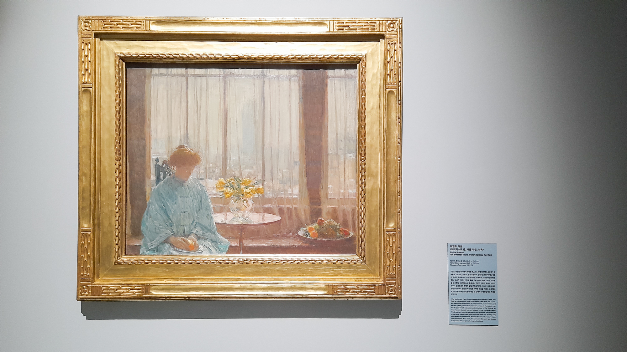 파리에서 유학한 차일드 하삼은 ‘미국의 모네’로 불릴 정도로 미국을 대표하는 인상파 화가다. 뉴욕에 정착한 하삼은 미국의 물질주의와는 차별화되는 일본의 미학에 관심을 가졌다. <브렉퍼스트 룸, 겨울 아침, 뉴욕>은 커튼이 미국의 물질주의와 일본의 미학을 이분법적으로 나누는 역할을 한다. 차단된 바깥은 번잡한 뉴욕의 현대적인 삶이다. 보호된 내부는 일본의 기모노를 연상시키는 복장에서 알 수 있듯이 조용한 일본의 미학이다. 나 역시 잔잔하고 섬세한 정서의 일본 문화 콘텐츠에서 힐링을 얻을 때가 많아서일까? 이 그림을 보면서 왠지 공감이 되었다.