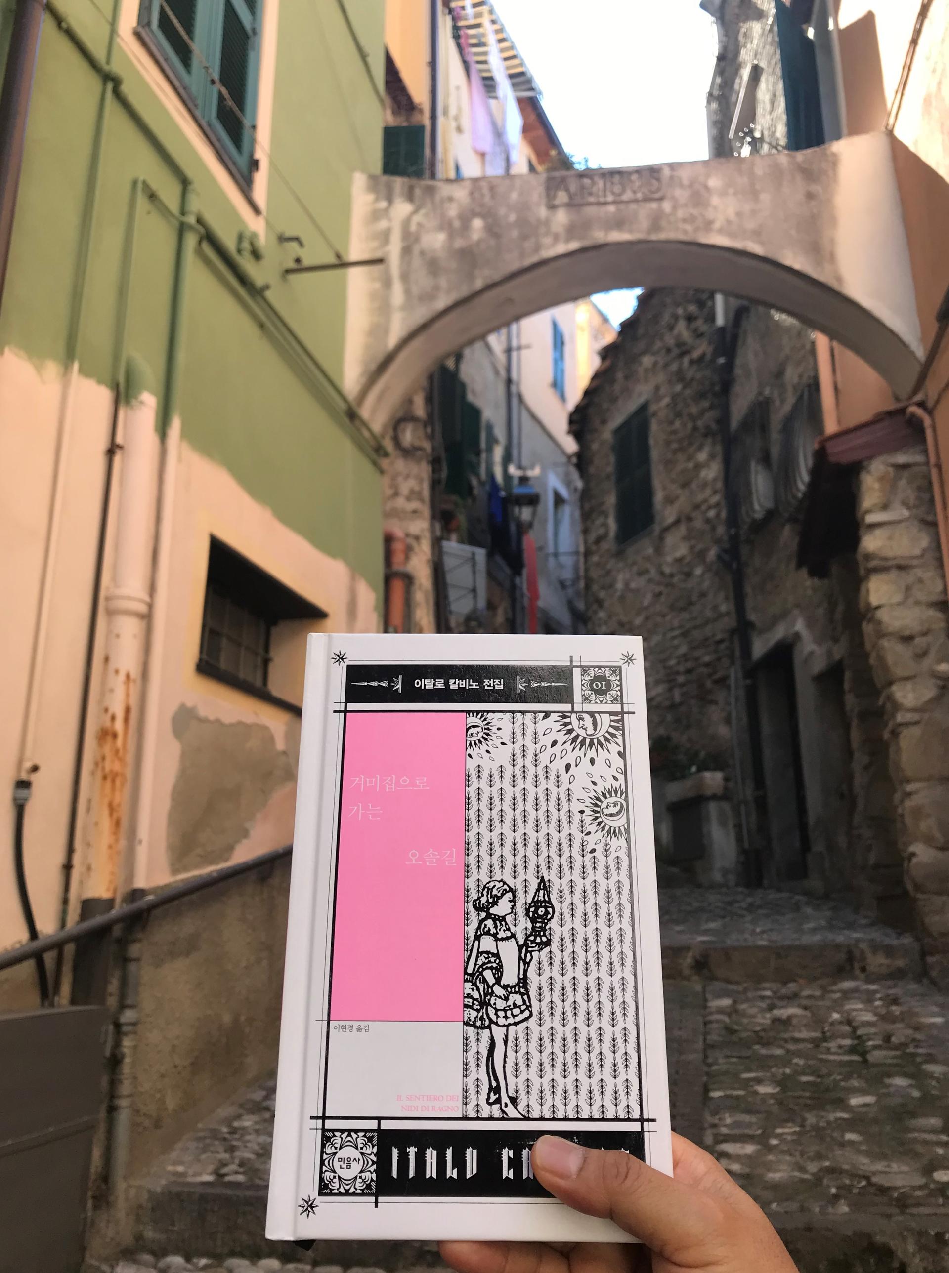 피냐의 골목을 배경으로 내가 번역한 『거미집으로 가는 오솔길』의 사진을 꼭 찍고 싶었다. 그리고선 이 책과 다른 몇 권의 칼비노 소설 번역본을 산레모 시립 도서관에 기증했다. 골목을 걷다보니 어디선가 애어른인 핀이 튀어나와 쉰 목소리로 짓궂은 농담을 할 것만 같았다.