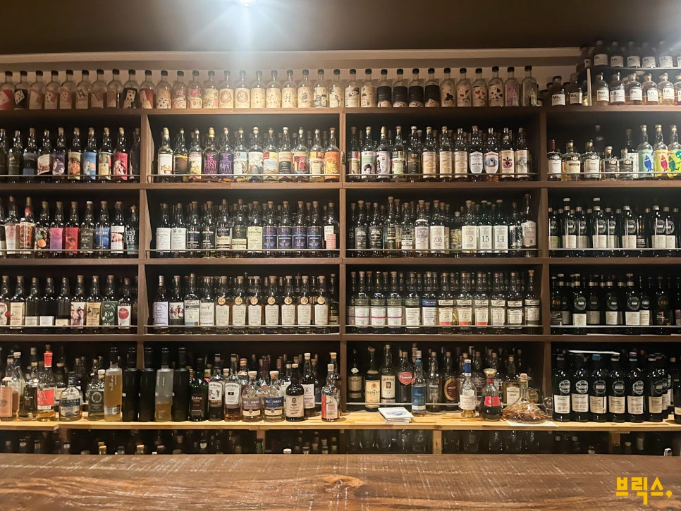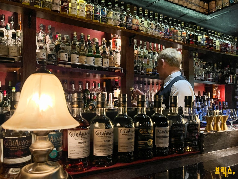 백 바에 위스키가 빼곡히 놓여있다.
