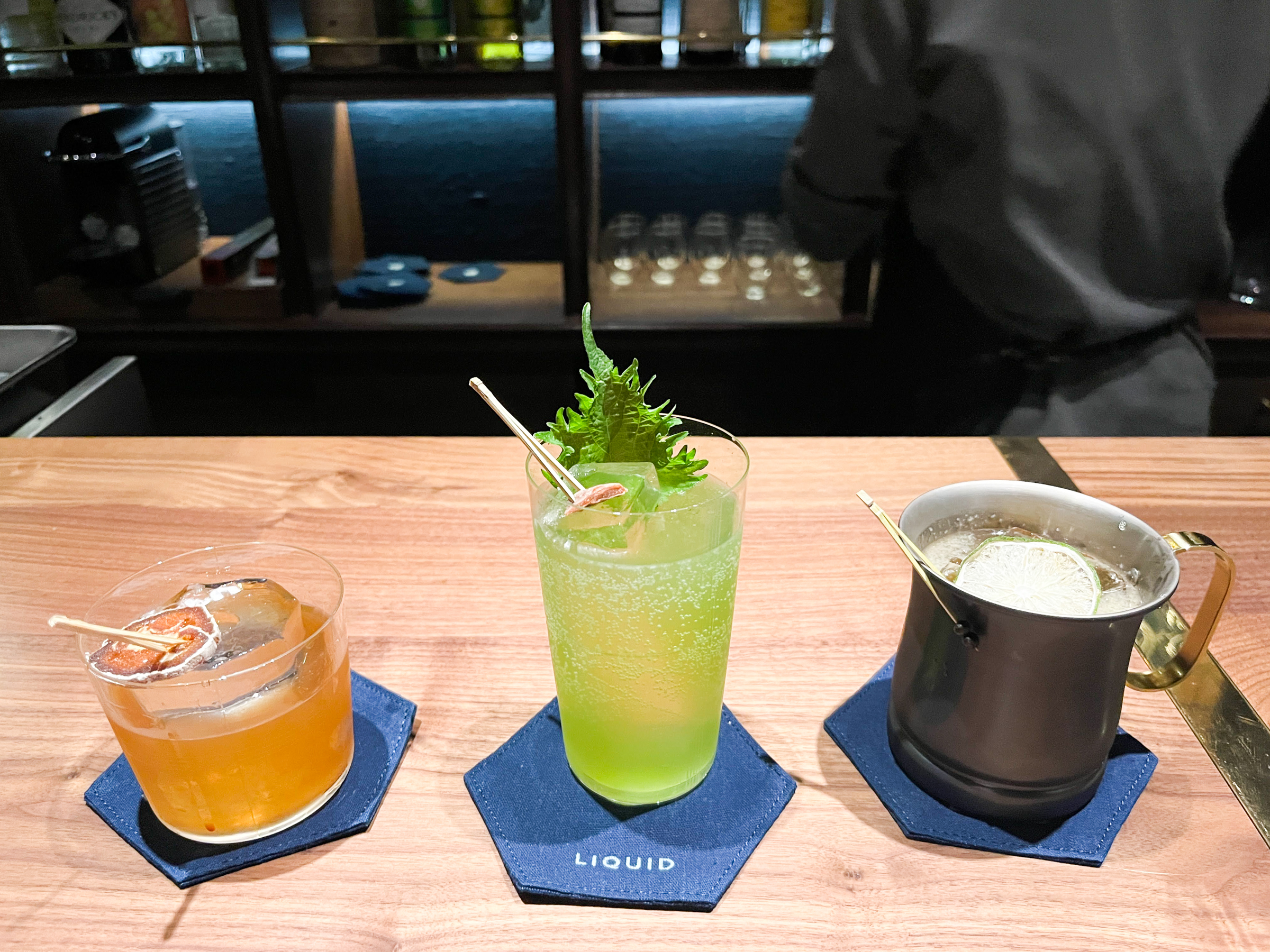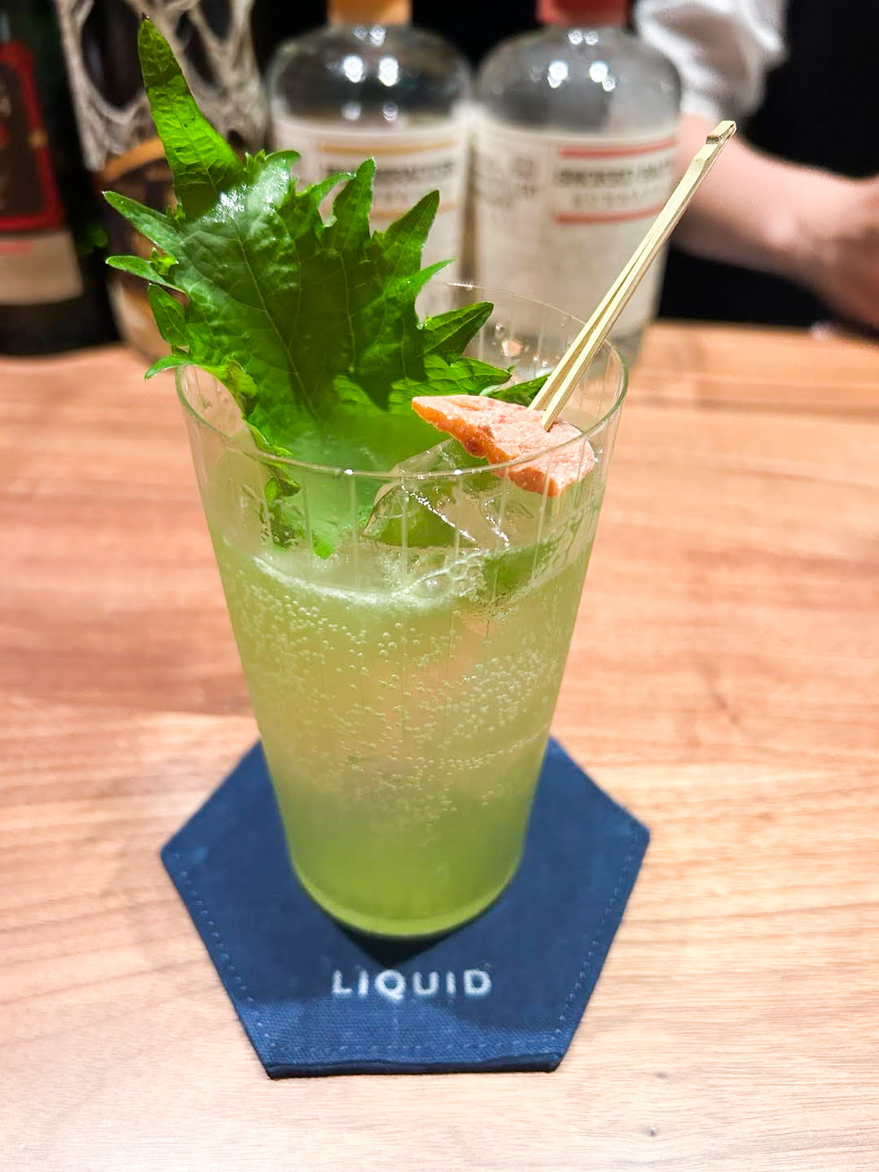 가게는 크지 않고 8명쯤 앉을 수 있는 카운터석과 2인이 앉을 수 있는 테이블이 4개 정도 있다. 리퀴드의 가장 큰 매력은 일본 식재료를 활용한 칵테일을 마셔 볼 수 있다는 것이다. 그 중에서 가장 인상적인 건 우리에게는 낯설지만 일본 요리에 자주 사용하는 ‘시소’로 만든 칵테일이다. 바질 스매시를 변형해 바질 대신 시소를 사용한 칵테일로 시소 특유의 향과 쌉쌀함이 라임, 말린 매화 등과 어우러져 독특하면서도 조화로운 맛을 선사한다. 시소를 싫어하지 않는다면 꼭 도전해 보기를 권한다.