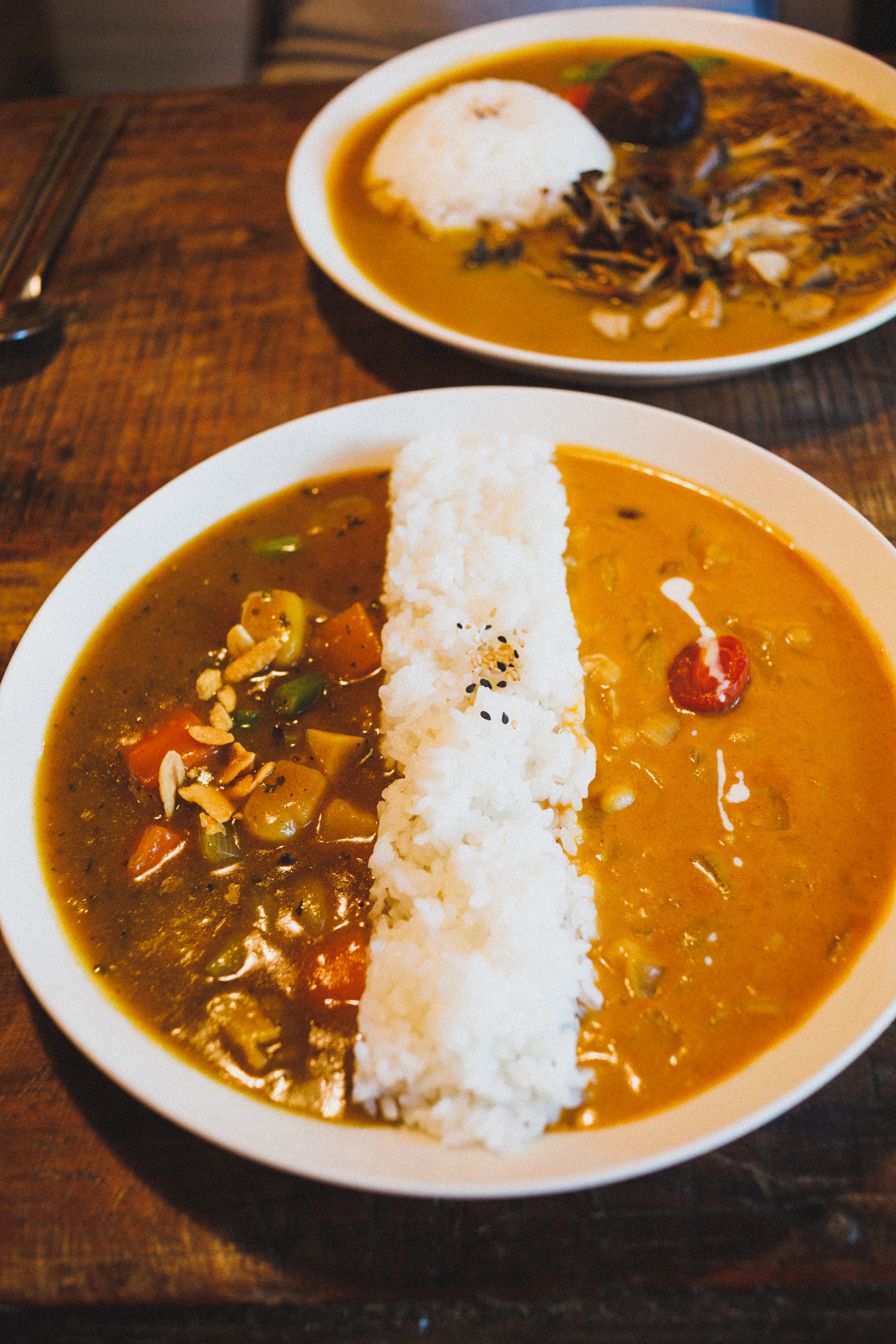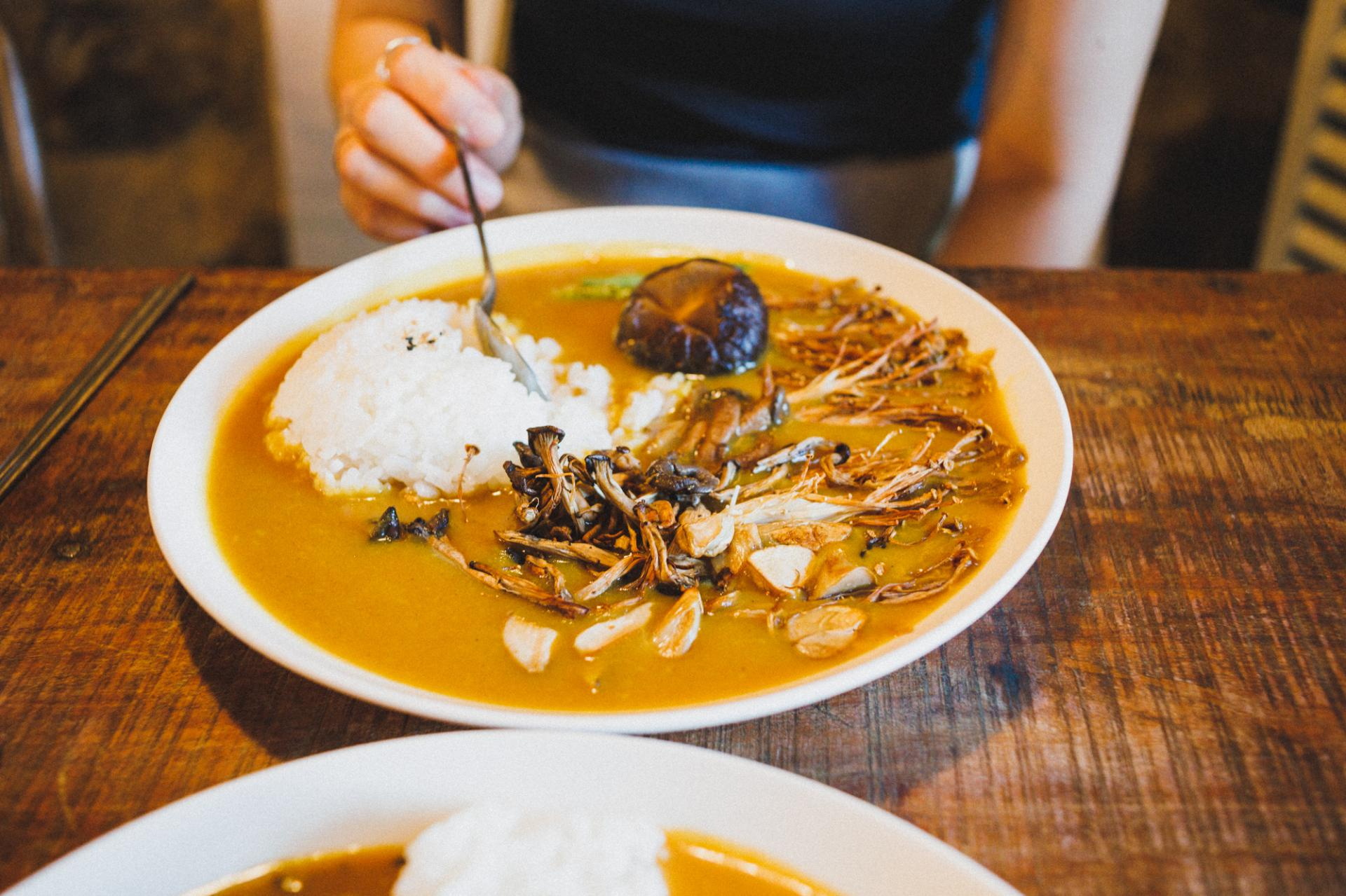 톰톰카레의 매력이라면 콩, 시금치, 버섯, 톳 등 채소를 베이스로 한 카레만 선보인다는 것입니다. 동일한 카레에 토핑만 달라지는 게 아니라 재료마다 카레 조리법이 달라요. 그래서 카레 좋아하는 사람들에게 어떤 맛을 선택할까 행복한 고민을 안겨주지요. 동시에 고민이 너무 깊어지지 않도록 '반반카레'라는 반가운 메뉴도 있어요. 접시 가운데 밥을 길게 올리고 양쪽에 야채, 콩, 시금치 카레 중 두 가지를 담아주지요. 보기만 해도 군침이 도는 비주얼입니다.