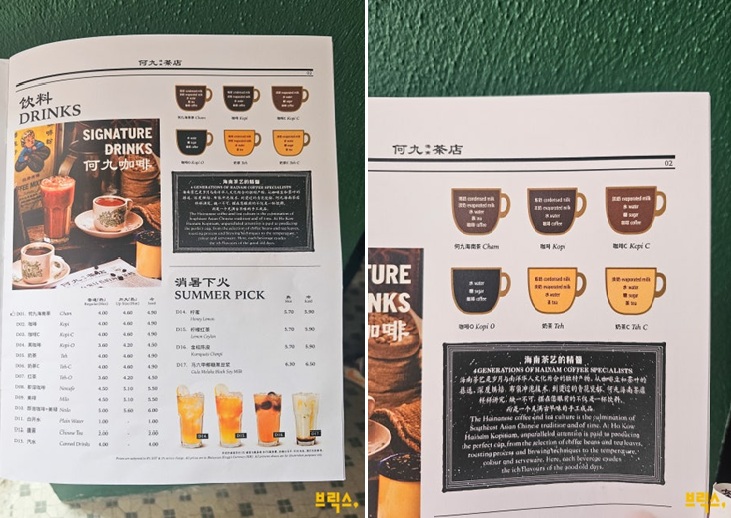 기본 중의 기본인 카야토스트는 코코넛, 판단 잼 중 선택할 수 있다. 카야 잼과 버터는 각각 맛보면 특별한 맛이 없지만, 바싹하게 구워진 식빵 사이에서 만났을 때 달콤하고 부드럽게 제 역할을 다한다. 반숙 계란을 추가로 주문해서 그릇에 톡 깨뜨린 다음 간장이나 소금으로 간을 추가하고, 토스트와 함께 즐기면 새로운 맛의 조합이다. 클래식 화이트커피는 역시 잘 어울리고 오리엔탈 모카 아이스나, 테(Teh, 밀크티)도 추천한다. 한국의 소보루 빵을 좋아한다면 오리엔탈 폴로 번도 주문해 보자. 새우탕면, 나시르막 등 전통 식사 메뉴와 디저트까지 매우 다양해 골라 먹는 재미가 있다.