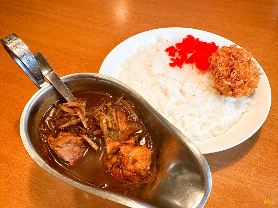 런치타임에는 ‘오늘의 인도풍 카리 런치(本日のインド風カリーランチ)’라는 메뉴가 3종(A, B, C) 있습니다. ‘오늘의 인도풍 카리 런치’에는 카니크림 고로케 토핑이 포함되지 않으니, 별도로 카니크림 고로케를 토핑을 추가하는 걸 추천합니다(카니크림 고로케 토핑 +280엔). 닭고기와 야채가 듬뿍 들어 있는데 참 착한 가격이지요.
