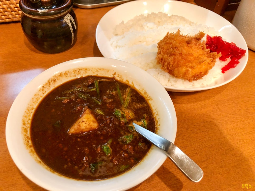 ‘오늘의 추천 인도풍 카리 카니크림 고로케 토핑(1,150엔)’도 시켜봅니다. 제가 방문했을 때는 다진고기와 시금치 카리(ひき肉とほうれん草のカリー)였어요. 다진 고기가 들어간 카레는 일본에서 아주 흔하고 키카카레(キーマカレー)라는 이름으로 사랑을 받고 있습니다. 개인적으로는 그냥 인도풍 카레보다 다진고기가 들어간 메뉴가 더욱더 맛있더라고요.
