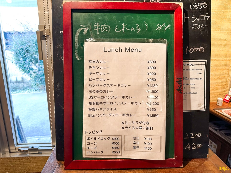메뉴가 많은데, 혹시 무엇을 먹을지 고민되면 ‘오늘의 카리(本日のカリー)’를 주문하면 좋을 것 같습니다. ‘오늘의 카리’는 그날의 추천 식재료(고기나 채소류)를 알아서 골라 주는 메뉴이고, 기본 메뉴보다 30~50엔 싸게 제공해 줍니다. ‘오늘의 카리’는 가게 입구(문 앞)와 카운터석 위에 적혀 있습니다. 그런데 ‘오늘의 카리’도 날마다 종류가 여러 개가 있어요.