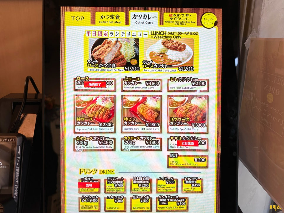 일본에서는 카레도, 돈카츠도 국민식인데, 둘을 합친 ‘카츠카레’는 당연히 인기 있을 수밖에요. 추천 메뉴는 ‘조 로스카츠카레(상 등심 카츠카레 ¥1,800)’입니다. 런치타임에는 저렴한 1,300엔짜리 ‘런치카츠카레’도 있지만, 돈카츠는 이쪽이 크기도 등급도 좋습니다. 더 비싼 메뉴로 특 로스카츠카레, 립로스카츠카레, 카타로스(목살)카츠카레 등도 있습니다만, 개인적으로는 조 로스카츠카레가 가성비가 제일 좋다고 생각합니다.