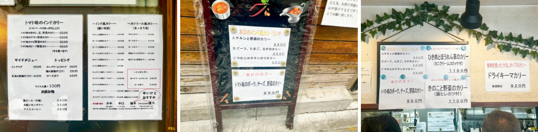 이곳의 카레는 루(카레 소스)가 3종 있습니다. 인도풍 카리(카레)(インド風カリー)는 10여 종의 향신료를 배합해 4, 5일 정도 푹 끓여 진하기 그지없습니다. 카슈미르풍 카리(カシミール風カリー)는 굳이 푹 끓이지 않고 향신료 본래의 향을 직접 잘 느낄 수 있도록 만든 스타일입니다. 토마토맛 인도카리(トマト味のインドカリー)는 토마토의 산미와 사과의 단맛이 느껴지는 상쾌한 카레이고요.