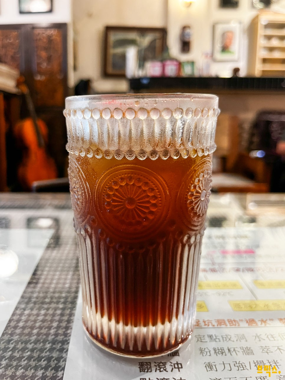 손님은 소수의 나이 든 사람들뿐. 내가 들어서자 백발의 단발머리 할아버지가 다가와 중국어로 무언가를 말한다. 내가 외국인임을 파악하자마자 그는 단순하게 "HOT? ICE?"라고 물었다. 무더운 날씨에 땀을 흘리며 걸어온 터라 차가운 음료로 부탁했다.
