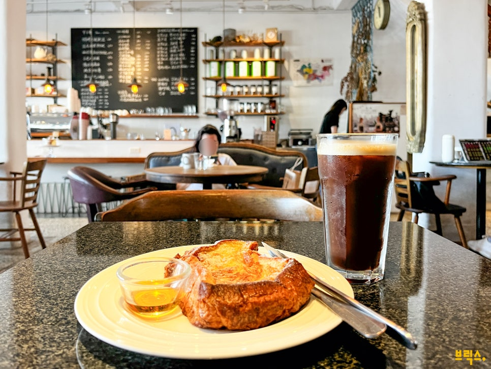 평범하게 아메리카노와 프렌치 토스트를 주문. 아이스 아메리카노는 딱 상상했던 그 맛이었다. 예상보다 약간의 산미를 더한. 계란물에 푹 젖어 고소하게 구운 프랜치토스트는 부드러웠다. 여기에 시럽까지 뿌려먹으니 완벽 그 자체. 조용한 아침식사를 즐기기에 딱 알맞다.