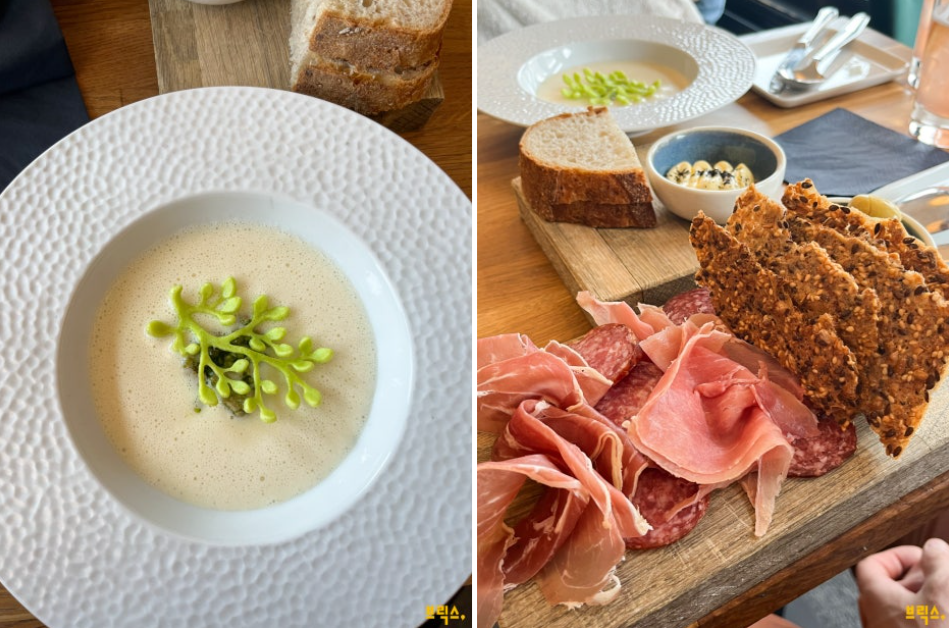 운전을 해야 하는 관계로 루바브와 레몬맛 무알코올 칵테일을 주문했습니다. 무알코올 맥주도 있고요. 술알못이라 원하는 맛을 바텐더 직원에게 설명했더니 최상의 조합으로 척척 만들어주셨습니다. 비록 무알콜이지만 안주를 놓칠 순 없죠! 오늘의 수프와 계절 테이스팅 메뉴인 Local cured meat platter를 주문했습니다. Meat platter에는 씨앗 플랫 브레드와 올리브, 그리고 세 가지 종류의 숙성된 육류(양고기, 살라미, 순록 고기)가 제공되었습니다. 확실히 북부에서 순록 고기를 보다 흔하게 먹긴 하네요.