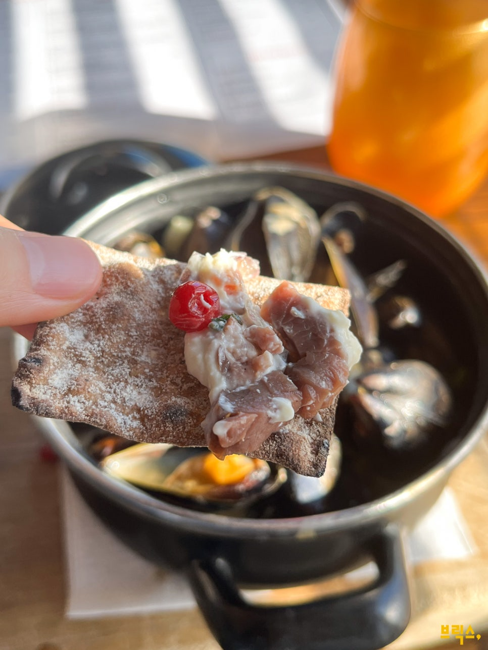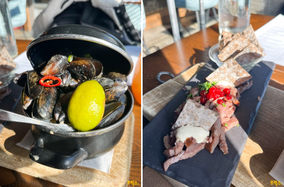 타파스라는 메뉴의 특성상 혼자보다는 여럿이 같이 와서 다양한 메뉴를 주문하는 편이 좋을 것 같아요. 이 지역에서 신선하게 공급되는 순록 고기와 조개류 메뉴가 특히 인기가 많다고 해서 훈제 순록 고기 메뉴인 Reinsdyrtrio와 홍합 찜 Blåskjell을 주문했습니다.