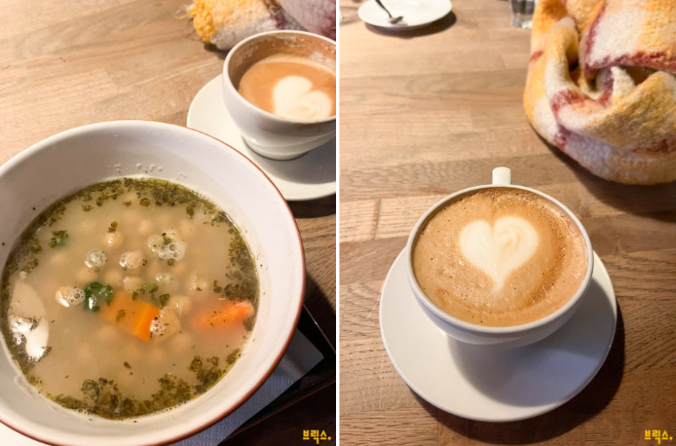 아점 메뉴로 따뜻한 국물이 생각나서 주문한 오늘의 수프(렌틸 콩 수프)와 카푸치노