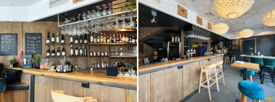 이렇게 환한 곳에서 즐기는 아늑하고 아기자기 한 느낌의 와인바는 색다른 매력이었습니다. 벽에 진열된 와인 병마다 글라스/보틀 가격이 적혀 있습니다. 와인바인데 분위기가 전반적으로 아기자기 귀여운 인상이에요.