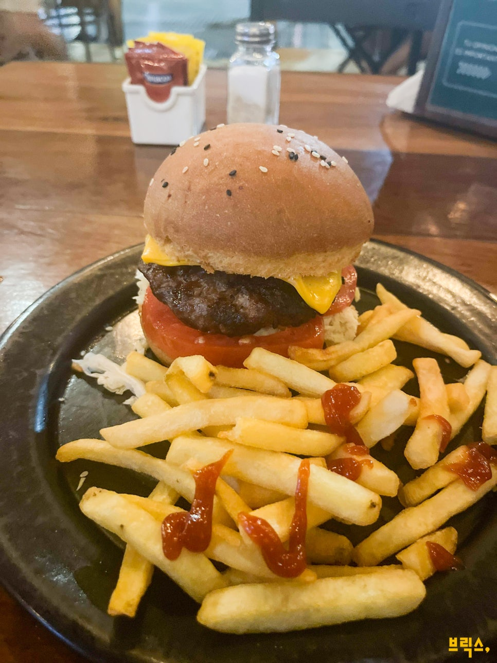 후끈한 공기 속 시원한 맥주와 수제 버거