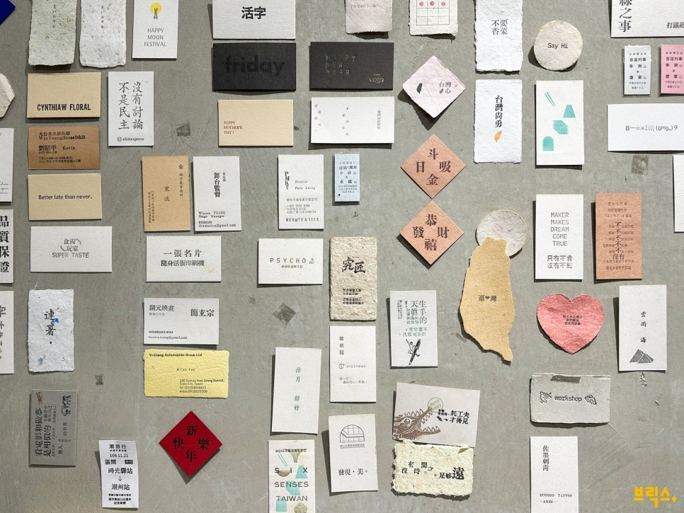벽에 붙여 놓은 명함들
