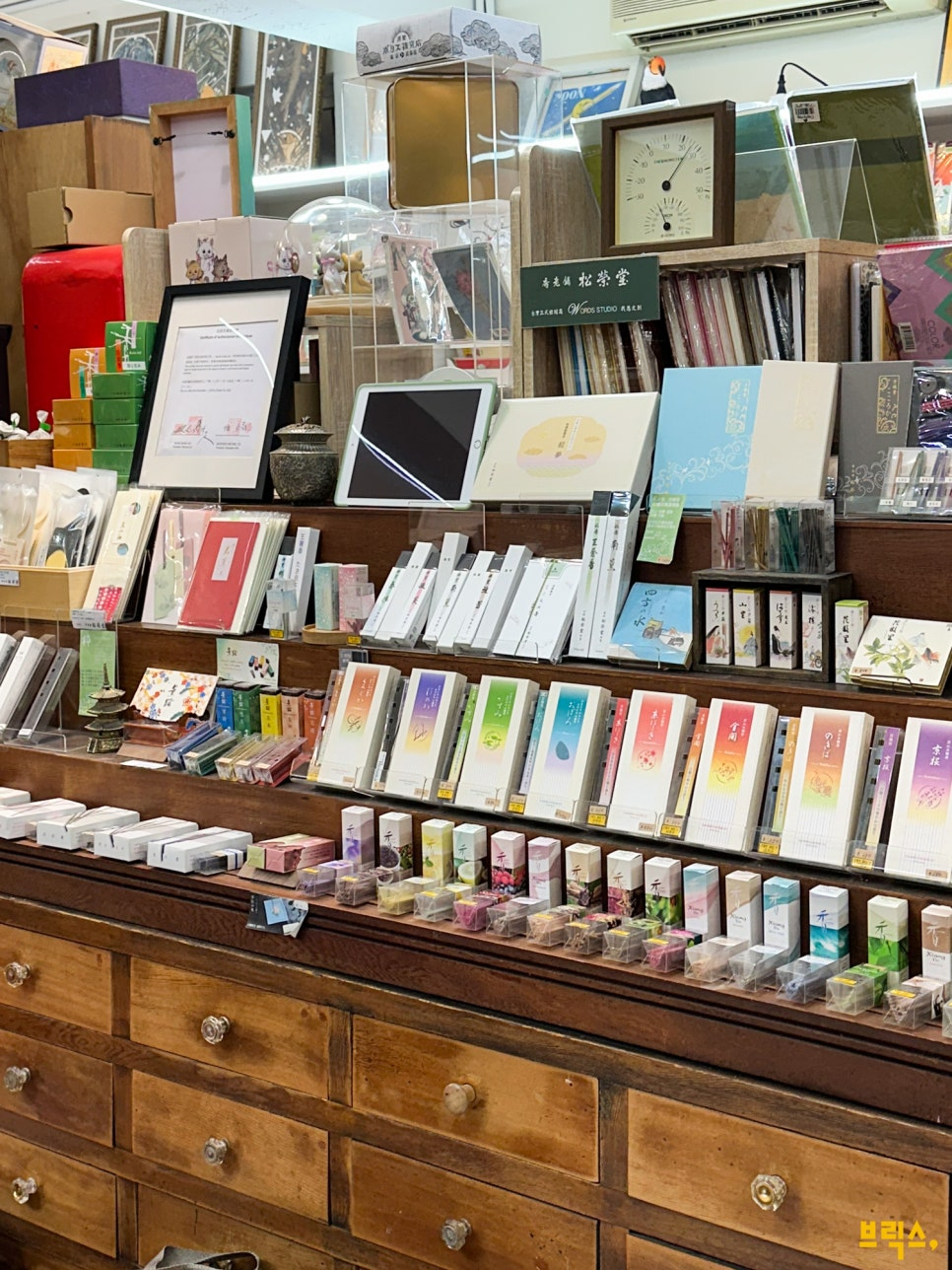 개인적으로 흥미를 끌었던 건 아이러니하게도 엽서가 아닌 공간을 가득 채우고 있었던 향이었다. 평소 향을 즐겨 사는지라 매장을 둘러보다가 눈에 익은 이름 하나를 발견했던 것. 300년 전통을 자랑하는 교토의 로컬 향 브랜드인 송영당(松栄堂)으로, 향 덕후들 사이에선 이미 잘 알려진 송영당의 제품들이 뜻밖에도 엽서 전문점을 표방하는 이곳에 꽤 다양한 라인업으로 진열되어 있었다. 호기심에 주인에게 이유를 묻자, 뜻밖의 이야기가 돌아왔다. 미국 유학 시절 떠났던 일본 여행에서 송영당을 처음 알게 되었다는 주인. 그 이후 오랜 시간 애정을 이어오다, 매장을 열고 나서도 향만큼은 정말 좋아하는 브랜드를 직접 사용하고 싶었다고. 그렇게 이곳에서 송영당의 향을 다루기 시작한 지도 벌써 5년이 넘었단다.