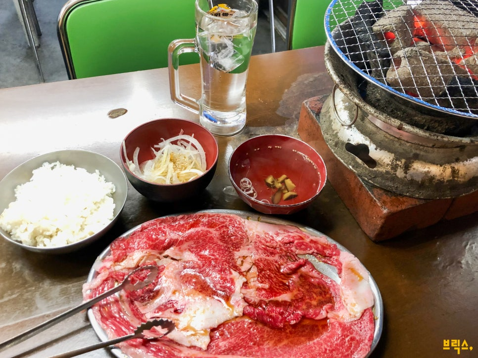 저는 평일 런치 한정 메뉴(평일 오후 1시 30분 ~ 3시 제공)인 ‘야키니쿠 정식(焼肉定食)’을 주문했습니다. 즉석 양념육, 맑은 국, 잘게 자른 양파가 제공되고, 가격은 딱 1,000엔! 숯불 화로에 각자 알아서 구워먹는 방식이라 혼밥도 편하게 즐길 수 있습니다. 한국인에겐 신기한 풍경일 수도 있겠지만, 여기는 런치 시간대에 방문하는 손님의 절반 정도가 혼밥으로 이용합니다. 물론 저녁 시간대는 단체 손님이 훨씬 많지만요.