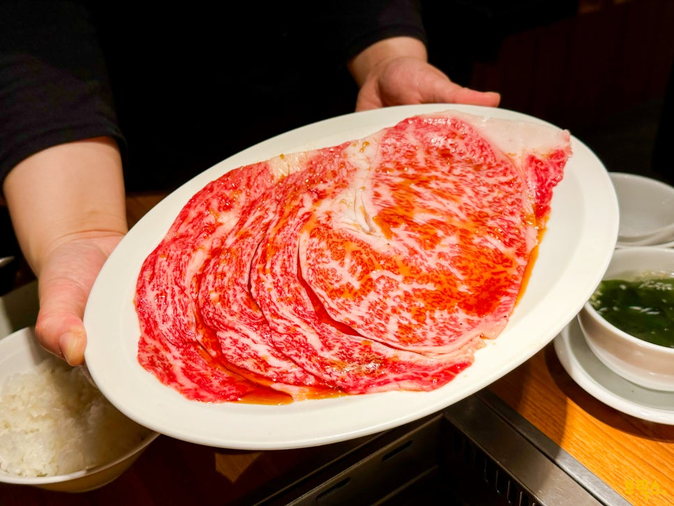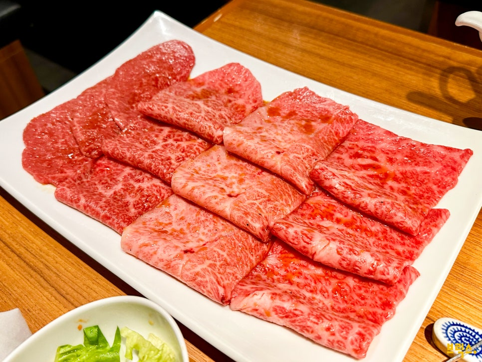 시로카네점은 주말만 런치타임에도 영업을 합니다. 그날 저희는 런치 메뉴인 키와미 세트(極味セット, Ultimate Set ¥15,000)를 주문했습니다. 이건 단품으로 골고루 주문하는 것보다 훨씬 싸게 먹을 수 있는 메뉴입니다. 안심살 or 샤토브리앙, 노하라야키, 우설, 오늘의 부위 2종, 미스지(부채살), 자보톤(살치살), 하라미(안창살)가 코스로 나옵니다. 다만 ‘우시고항(牛ご飯, 소안심 솥밥)’은 시로카네점에서 제공하지 않으니 주의하시기 바랍니다.