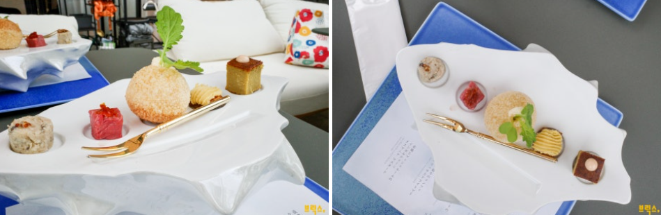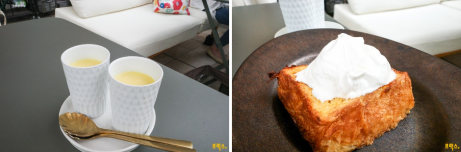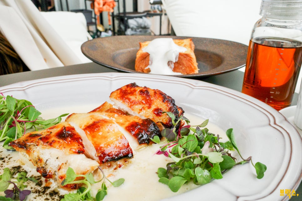 테라스를 즐기기 위해 방문한 만큼 음식에는 큰 기대를 하지 않고 방문했다. 그러나 처음 나오는 에피타이저부터 나름의 구색을 갖추어 내어준다. 엄청 뛰어난 맛은 아니지만, 입맛을 돋우기에 부족함이 없으며, 가격을 생각하면 더욱 훌륭하게 느껴진다. 이어서 수프와 프렌치토스트가 제공되는데, 프렌치토스트는 적당한 단맛의 마스카포네 치즈크림을 얹어 먹는다. 폭신한 식감이 훌륭하다. 이곳의 마스카포네 치즈크림은 앞으로 나올 메인과 함께 즐기는 것은 물론 디저트로 그냥 먹기에도 괜찮다.