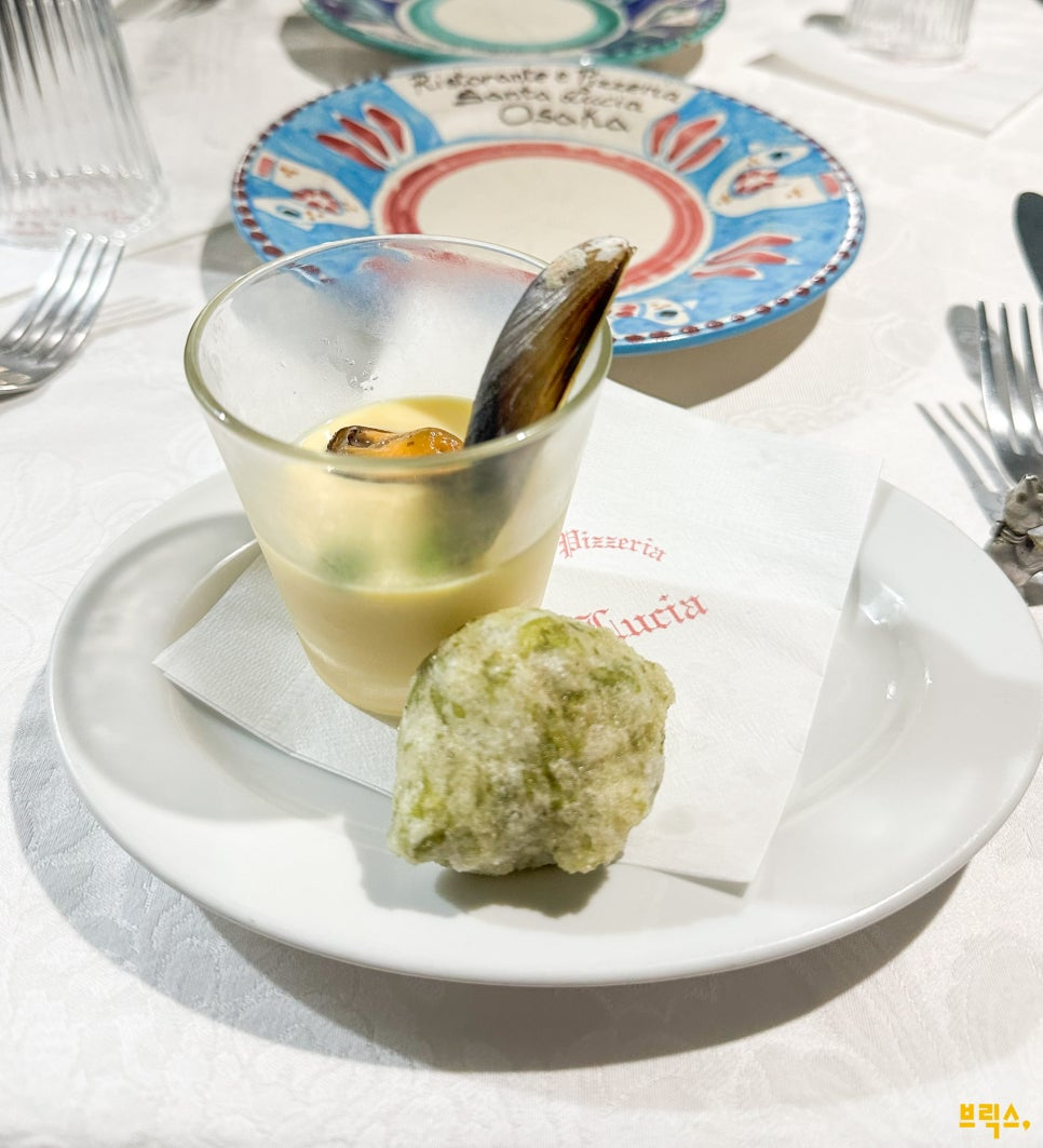 주류 주문을 하면 자릿세 비슷하게 인당 500엔 정도가 청구되지만 애피타이저를 내어 주신다. 이 날은 도우반죽에다가 김을 버무린 프리토(이탈리아식 튀김)와 홍합을 올린 차완무시였는데, 반죽의 발효가 너무 완벽해서 식감과 향이 매력적이었다. 특히 김이 들어간 일본식 터치가 이탈리안과 너무 잘 어울린 한 접시였다.