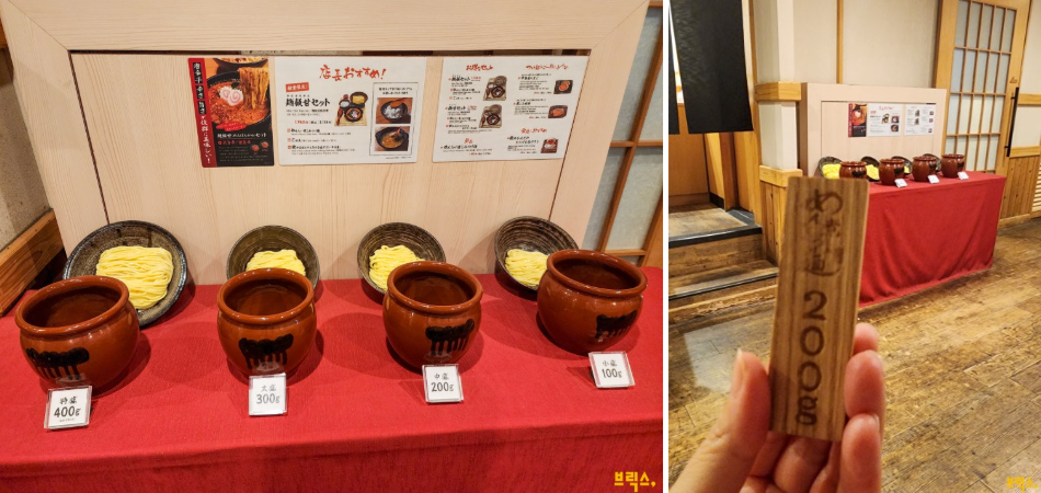 일단 차례가 되어 입장하면 면의 양을 선택해야 한다. 한 테이블 위에 면의 양을 보여주는 모형이 놓여 있는데, 자신의 식성에 맞춰, 혹은 배고픈 정도에 맞춰 양을 선택하고 나무로 된 표찰을 들고 대기하면 된다. 이 독특한 시스템이 즐거움을 더해준다.