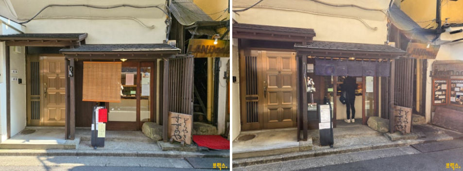 가게 외관. 오후에 가면 상품이 모두 품절될 수 있다. 아직 영업 중이면 오른쪽 사진처럼 포렴이 걸린다.