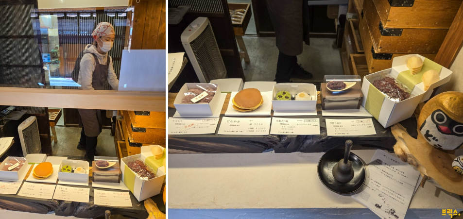 좁은 가게. 상품은 단 네 종류뿐으로 왼쪽에서부터 계절 떡, 도라야키, 계절 화과자, 테즈쿠리 모나카이다.
