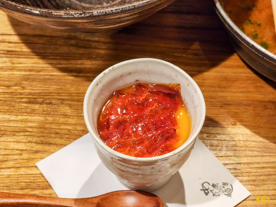각 테이블에는 매운 정도를 조절할 수 있는 특제 소스가 놓여 있다. 이 소스도 베이스는 명란이라고 한다. 소스를 넣으면 매운맛과 감칠맛이 올라가지만, 짠맛도 같이 상승하기 때문에 한꺼번에 많이 넣지 않도록 주의해야 한다.