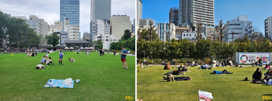 미나미 이케부쿠로 공원은 이케부쿠로 역에서 5분도 채 걷지 않아 갑자기 툭 튀어나오는 잔디 공원이다. 이런 곳에 공원이? 라는 느낌이다. 규모가 아주 큰 건 아니지만, 제법 넓게 펼쳐진 잔디밭에선 아이들이 뛰어놀고, 평일엔 직장인들이 휴식을 취한다. 그야말로 도심 속의 작은 오아시스다.