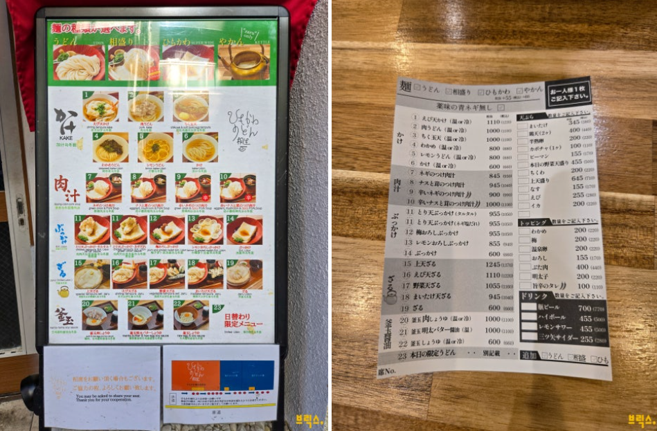 주문할 때는 한 사람에 한 장씩 주문지를 작성해야 한다. 먼저 면 종류를 정하고, 국물 종류를 정하면 된다. 토핑으로, 혹은 사이드로 튀김도 주문할 수 있다. 히모카와 면과 일반 우동면을 반씩 섞은 면에 닭튀김을 얹은 붓카케 우동과, 역시 두 종류 면에 채소 튀김을 곁들인 자루 우동을 주문했다.