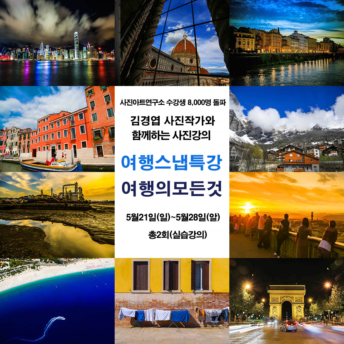 촬영의 기본, 그러니까 노출, 구도, 조명, 후보정 등 카메라와 편집 프로그램을 배우는 기초 과정부터 본격적인 예술 표현을 배우는 순수 사진작가 과정까지 다양합니다. 보통은 몇 주에 걸쳐 강의가 진행되고요. 일회성이나 단기로 ‘스마트폰으로 사진 잘 찍는 법’, ‘여행 사진 잘 찍는 법’, ‘야경 잘 찍는 법’ 같은 클래스를 열기도 합니다. 특히 이런 수업이 인기가 많기는 합니다.