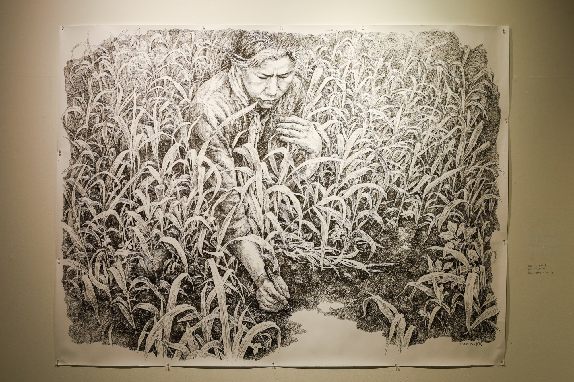 낮에 농사를 짓고 밤에 그 땅을 그린다는 의미로 그린 그림이에요. 낮에 식물에 대해 품었던 마음을 밤에 똑같이 이어 그림을 그린다는 의미도 있고요. 저는 어릴 때부터 농사에 익숙해서 모든 생명, 우리가 하는 모든 작업이 다 연결돼 있다고 생각해요. 제가 그림을 그림으로써 키우는 작물을 더 사랑하게 되는 면이 있어요. 농사라는 게 한시라도 관심을 놓으면 수확량이 틀어져 버리잖아요. 그리는 작업도 마찬가지에요. 끊임없이 하는 것이 제 숙명 같아요.