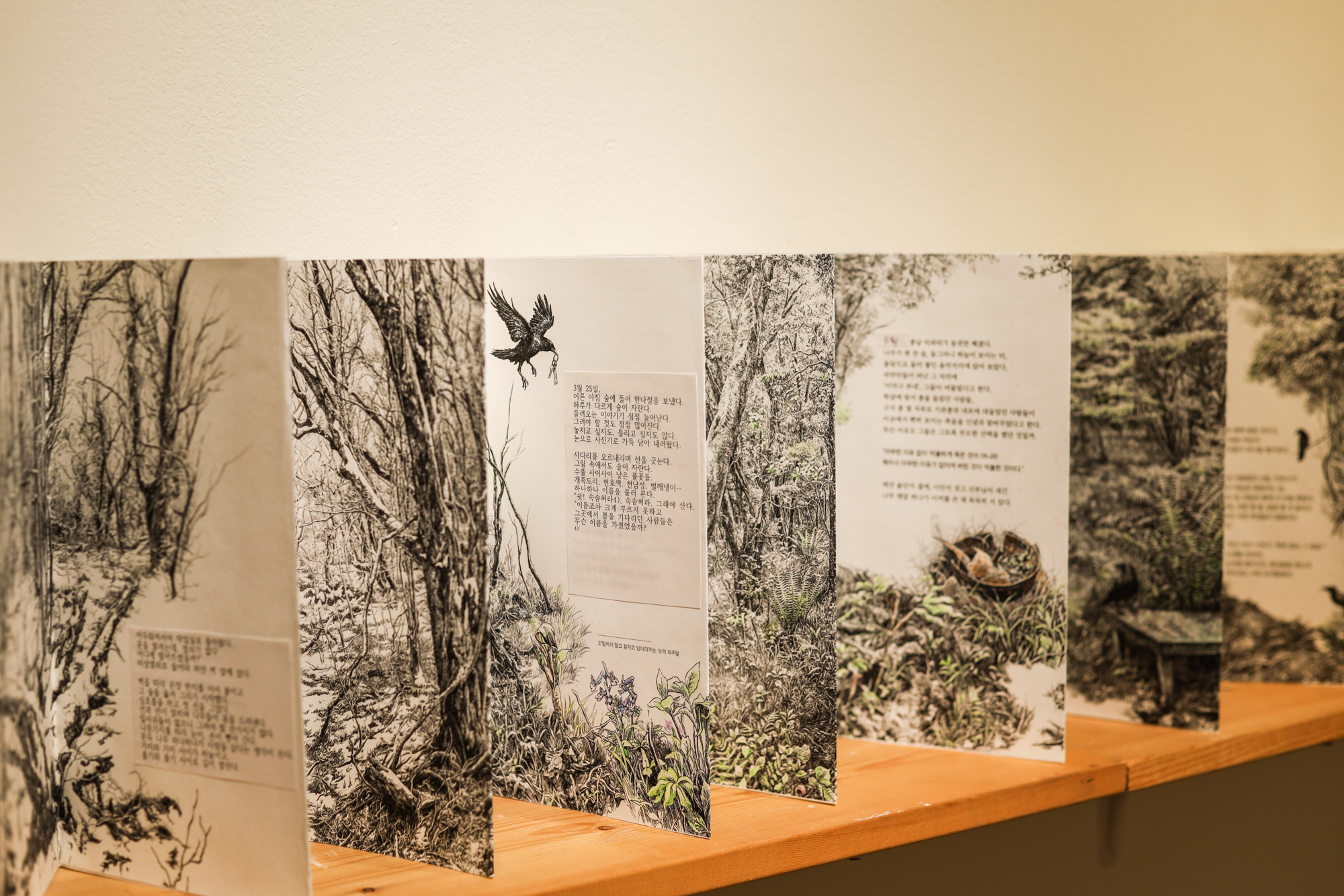 실제로 숲에 까마귀가 많았어요. 첫날 만난 까마귀들이 제 가까이 다가와서 뭐라 뭐라 하는데 왜 왔냐, 뭐 하러 온 거냐 묻는 것 같았어요 다음에 갔을 때도 같은 까마귀였는지 알 수는 없지만 같은 아이들일 수 있겠다는 느낌이 들었어요. 몇 번 눈에 익으니까 저쪽 터로 먼저 가서 앉아 있기도 하고, 동료들한테 까까까, 누구 왔다 알려주기도 하고, 경계한다기보다 반겨주는 것 같았어요. 저한테 무슨 말을 해주는 것 같기도 하고.