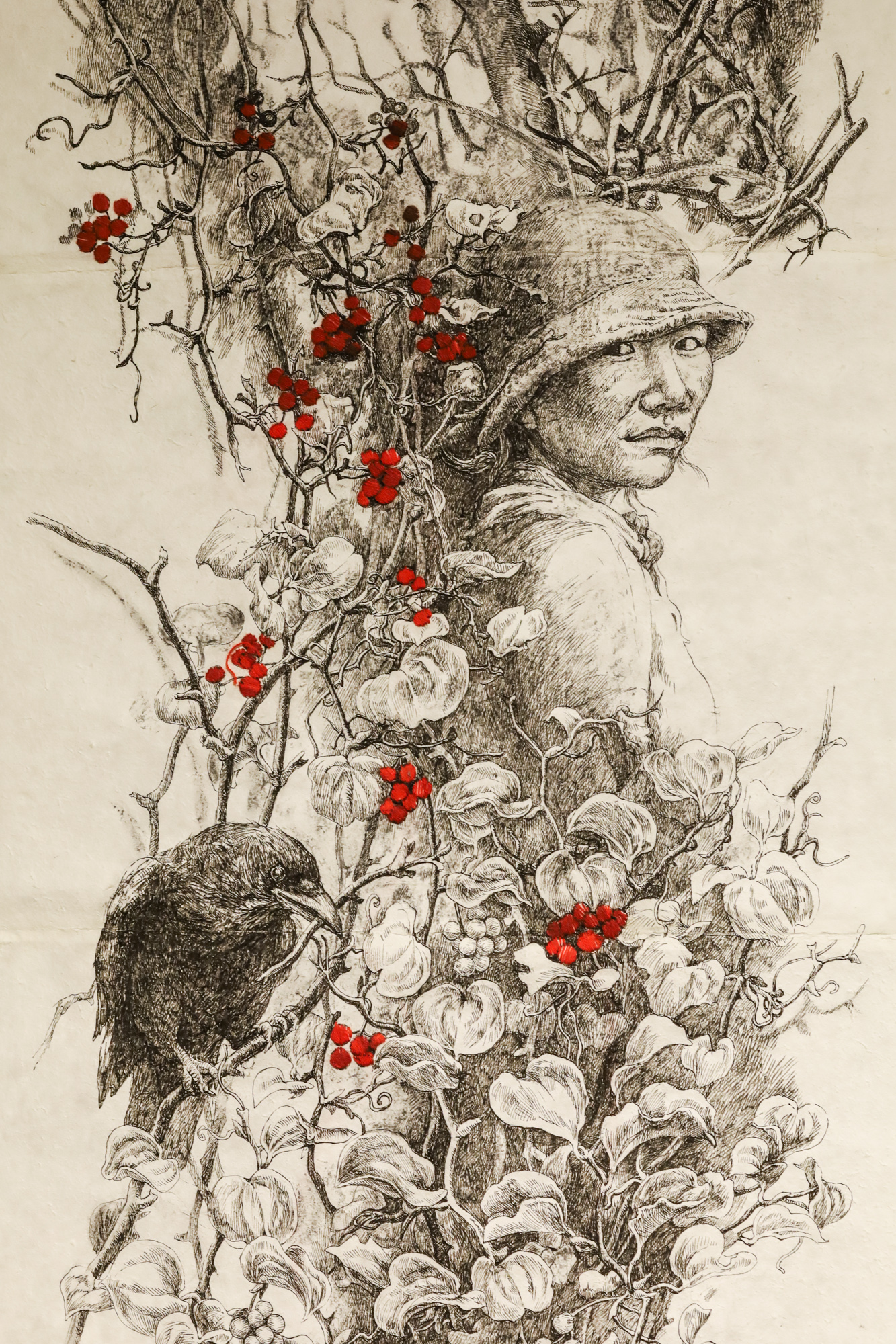 까마귀를 흉조로 보는 분들이 많지만 제주도에서는 신조(神鳥)예요. 고구려의 삼족오(三足烏)도 신격화된 새였지요. 제주 신화에서 까마귀는 인간 세계와 신의 세계를 왔다갔다하며 과거와 현재, 이승과 저승을 이어주는 존재예요. 그런 의미에서 까마귀는 이 그림에서 저의 메신저인 거지요. 저 대신 제가 말하고 싶은 장소에 앉아 여기를 자세히 봐 달라고 하는 이야기를 전해주고 있어요. 과거 사람들의 말을 저에게 건네주는 느낌, 그래 잊지 않고 찾아왔구나 하고 말해주는 느낌이었지요.