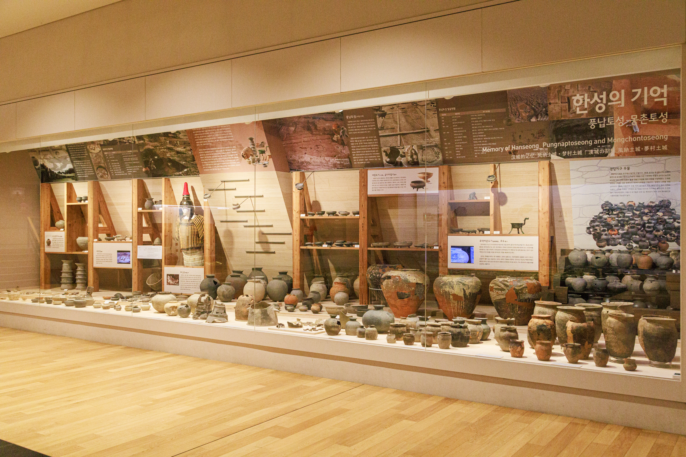 서울 백제 여행의 시작은 한성백제박물관입니다. 2012년 개관한 한성백제박물관은 백제를 중심으로 선사시대부터 남북국시대까지 다루는 고대문화 전문 박물관입니다. 입구로 들어서자마자 놀라운 광경이 펼쳐지는데요, 풍납토성의 실제 성벽이 마치 거대한 입체화처럼 로비 벽에 붙어 있습니다. 높이가 거의 10m에 달했다는 풍납토성의 규모가 실감이 됩니다. 역사적으로도, 장식적으로도 기대감을 부풀리기에 충분한 전시물입니다.