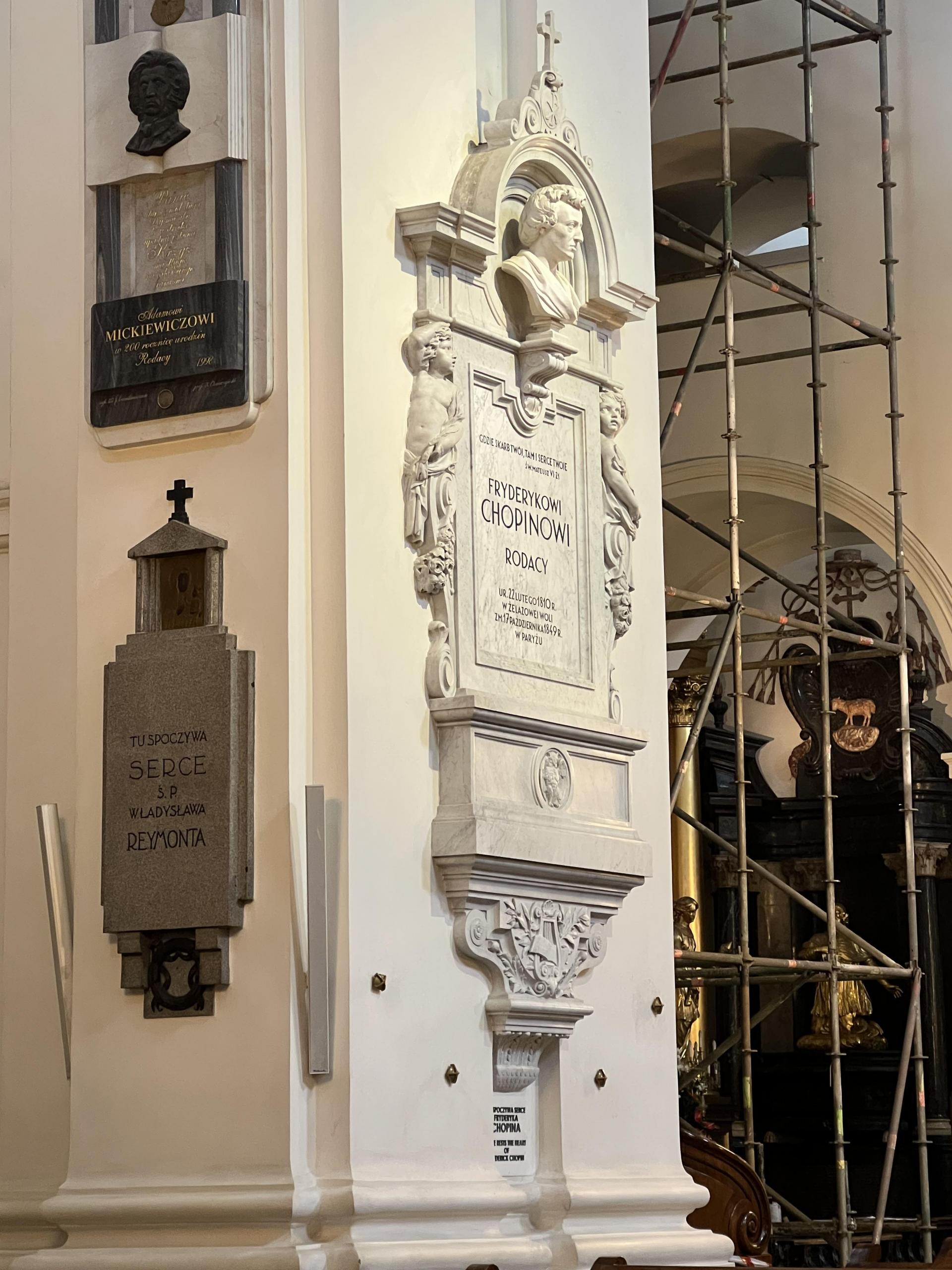 스무 살에 파리로 건너간 쇼팽은 이후 프랑스에서 숨을 거둘 때까지 고국인 폴란드로 한 번도 돌아가 보지 못했다. 쇼팽은 자신의 심장을 고국에 묻어 달라는 유언을 남겼고, 쇼팽의 누나는 장례 후 쇼팽의 심장을 챙겨 바르샤바로 돌아왔다. 쇼팽의 유해는 파리의 페르 라셰즈 공동묘지에 묻혔지만, 쇼팽의 심장은 바르샤바 성 십자가 교회 기둥 속에 봉인되었다. 성 십자가 교회에 들어섰더니 미사가 진행 중이라 쇼팽의 흉상과 함께 심장이 묻혀 있음을 알리는 조각만 멀리서 보고 나왔다. 교회 건너편에 놓인 등받이 없는 벤치 중 하나는 쇼팽의 곡을 들을 수 있는 벤치였다. 바르샤바에는 쇼팽과 직접 관련이 있는 장소에 총 15개의 쇼팽 벤치가 설치되어 있다. 아쉽게도 꽤 굵은 빗줄기가 내리기 시작해 벤치에 앉아보진 못했다.