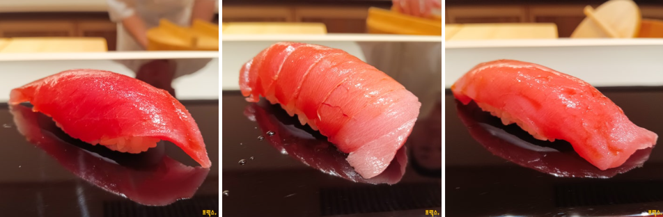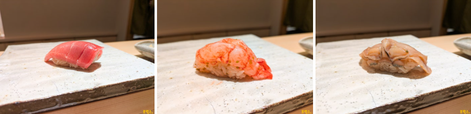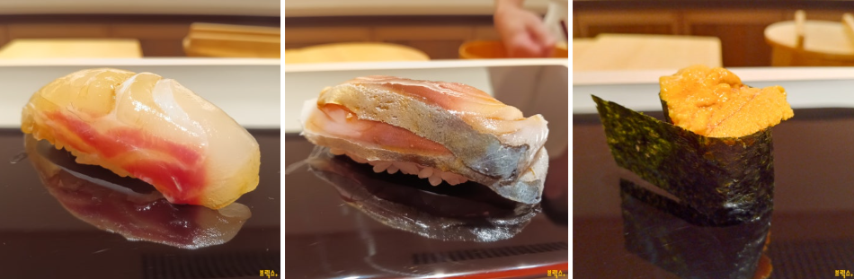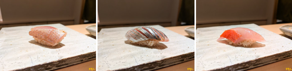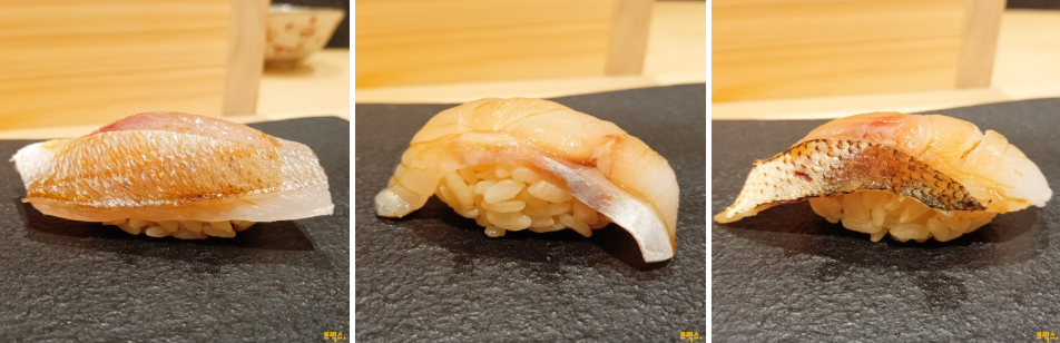 촉촉하면서도 부드러운 어린 도미부터 시작해서 시원한 산미가 느껴지는 가다랑어나 참치, 맛이 잘 스며든 대합 등 다 맛이 좋습니다. 특히 참치와 샤리의 산미가 조화가 좋은데요, 소금이 밸런스를 잡은 후 버터 같은 진한 기름기가 느껴진답니다.